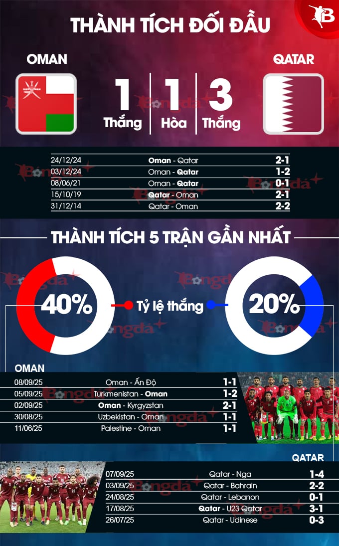 Oman đang rất khát khao tìm vé trực tiếp dự World Cup. Với việc đang có được phong độ khá tốt, Oman cho thấy họ sẵn sàng cho mục tiêu đánh bại Qatar ngay trên sân nhà. Ở cuộc đối đầu gần nhất vào tháng 12/2024, Oman cũng đánh bại Qatar trên sân nhà. Kịch bản tương tự nhiều khả năng sẽ tiếp tục diễn ra ở trận đấu sắp tới.