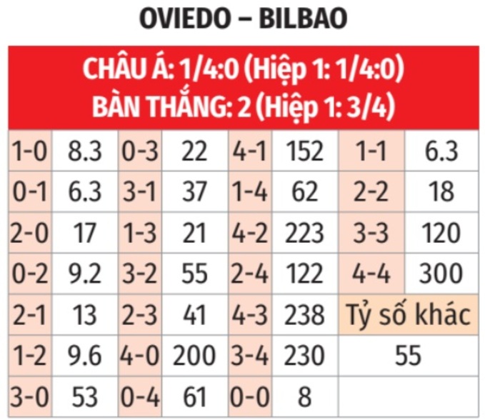 • Ít góc hiệp 1: 3/4 trận đấu gần đây của Oviedo chỉ có tối đa 4 quả phạt góc trong hiệp 1. Tình trạng tương tự xảy ra ở 4/5 trận sân khách vừa qua của Bilbao.