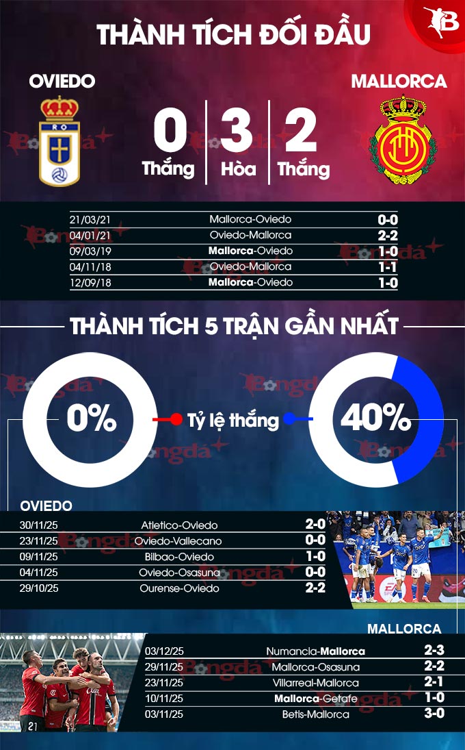 Quá khứ cũng có phần ủng hộ các cầu thủ đội khách. Thống kê cho thấy rằng, trong 5 lần chạm trán giữa 2 đội gần đây, Mallorca bất bại trước Oviedo. Thành tích cụ thể của họ là thắng 2 và hòa 3 trận. Điều này sẽ giúp cho các cầu thủ đến từ xứ đảo thêm phần tự tin để bước vào trận đấu với chủ nhà Oviedo.