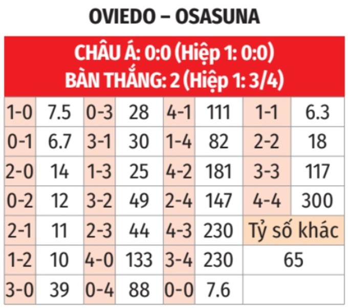 - Tối đa 4 góc hiệp 1: 3/4 trận đấu gần đây của Oviedo chỉ có nhiều nhất 4 quả phạt góc ở hiệp 1. Tình trạng tương tự xảy ra ở 6/7 trận vừa qua của Osasuna.