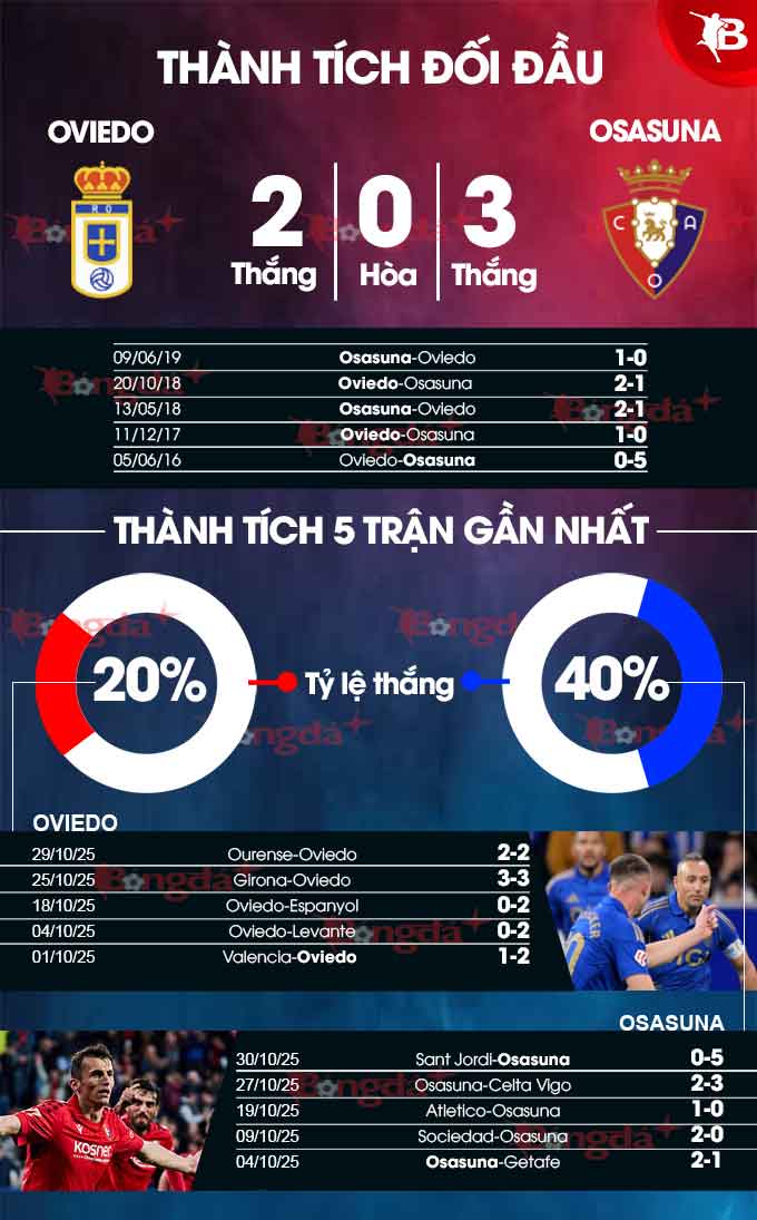 Osasuna vừa có chiến thắng 5-0 trước chủ nhà Sant Jordi ở Cúp Nhà Vua Tây Ban Nha. Kết quả đó giúp họ có sự khích lệ tinh thần rất lớn trước chuyến hành quân đến sân của Oviedo. Các học trò của HLV Alessio Lisci có cơ sở để hy vọng sẽ hoàn thành mục tiêu giành 3 điểm ở trận đấu muộn của vòng 11 La Liga.