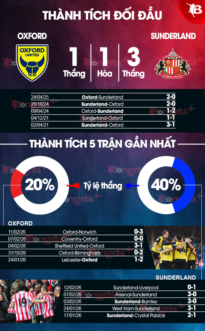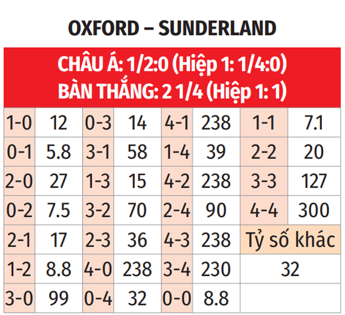 - Lẻ bàn thắng: 6/10 trận gần nhất của Oxford có tổng bàn thắng không chia hết cho 2. Chưa hết, 5/7 trận vừa qua của Sunderland chứng kiến điều tương tự.