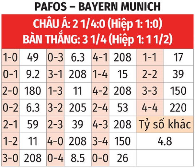- Hai đội cùng ghi bàn: Bayern Munich đang lấy công để bù thủ, khi hàng hậu vệ cho thấy sự hớ hênh, để lọt lưới 6/9 trận gần đây trên mọi đấu trường. Đây sẽ là cơ hội rất tốt để Pafos vốn chơi bùng nổ trên sân nhà có cơ hội chọc thủng lưới Manuel Neuer.