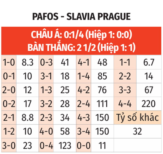 - Lẻ bàn thắng: 6/10 trận gần nhất của Pafos có tổng bàn thắng không chia hết cho 2. Ngoài ra, 6/8 trận vừa xong của Slavia Prague chứng kiến điều tương tự.
