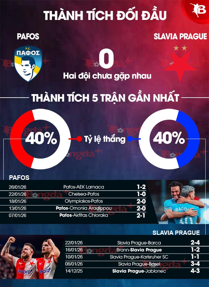 Phong độ đôi bên không nhiều chênh lệch khi cùng không thắng 3/5 trận gần nhất. Ở trận đấu tới, Pafos có lợi thế sân nhà và đang chơi tốt ở thời gian này khi bất bại 7/8 trận vừa qua. Đó là điểm tựa để họ tin vào 1 chiến thắng trước Slavia Prague, cũng như nuôi hi vọng mong manh lọt vào vòng play-off.