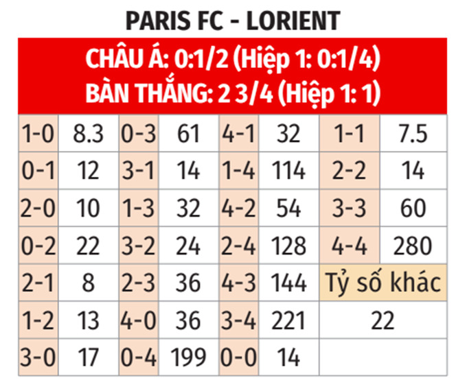 - Paris FC thắng theo châu Á: Paris FC thắng 3/4 trận gần nhất, thắng 11/12 trận sân nhà vừa qua (không tính giao hữu). Còn Lorient thua 5/8 trận gần đây, thua 6/8 chuyến làm khách gần nhất. Vì thế, những người yêu mến Paris FC có thể tin tưởng vào họ ở trận này.