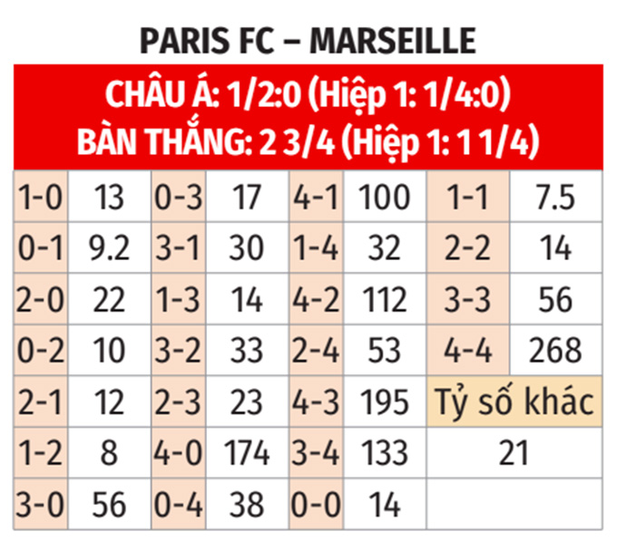 - Lẻ bàn thắng: 5/6 trận gần nhất của Paris FC và 4/5 trận vừa qua của Marseille đều có tổng bàn thắng là lẻ. Ngoài ra, 7/11 trận sân nhà gần đây của Paris FC và 12/14 chuyến làm khách vừa qua của OM cũng khép lại với tổng bàn thắng không chia hết cho 2. Trận này khó có ngoại lệ.