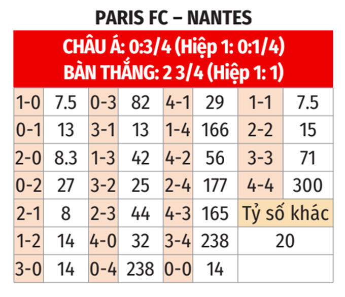 - Paris FC ghi bàn hiệp 1: Paris FC ghi được ít nhất 1 bàn thắng trong hiệp 1 ở cả 3 trận gần nhất. Họ cũng làm được điều tương tự ở 7/10 trận sân nhà vừa qua. Thật trùng hợp khi Nantes để thủng lưới ít nhất 1 lần trong hiệp 1 ở 3/4 trận gần đây, ở 7/11 chuyến xa nhà vừa qua.