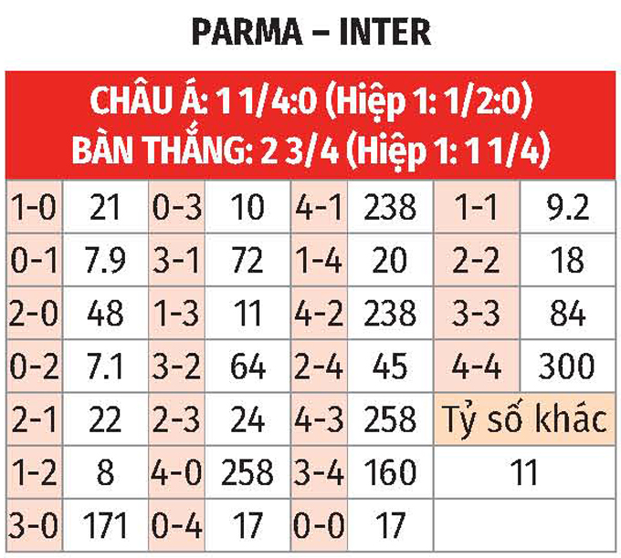 - Lẻ bàn thắng: 6/8 trận vừa qua của Parma có tổng bàn thắng không chia hết cho 2. Ngoài ra, 5/10 trận sân khách vừa qua của Inter đều chứng kiến điều tương tự.