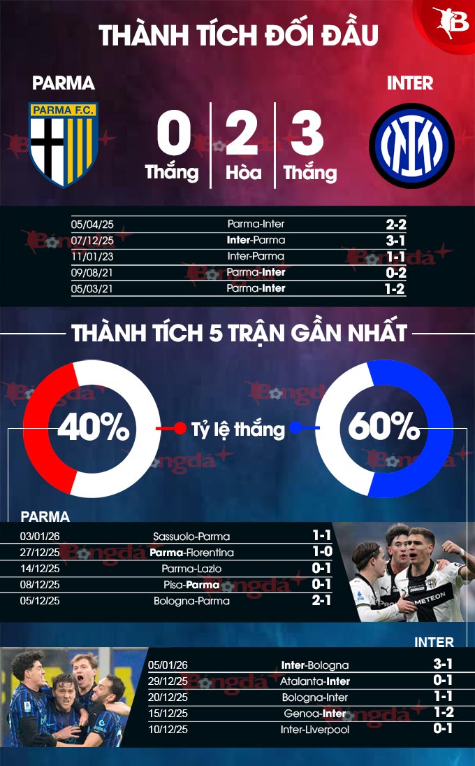Trong khi Parma thắng 2/6 trận gần nhất thì Inter thắng 4, hòa 1 và thua 1 ở cùng thời gian. Ngay cả khi có lợi thế sân nhà, Parma cũng vẫn bị đánh giá thấp hơn Inter bởi họ đang chơi không tốt tại đây khi chỉ thắng 2/8 trận vừa qua.