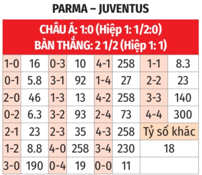 - Tối thiểu 1 bàn hiệp 1: 8/9 lần đối đầu giữa 2 đội gần đây đều có từ 1 bàn thắng trở lên trong hiệp 1. Tình trạng tương tự xảy ra ở 11/15 trận gần đây của Parma và 4/5 trận gần đây của Juve ở Serie A.