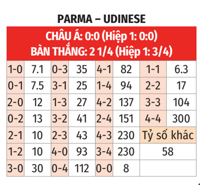 - Trên 2 bàn: Cả 5 trận gần đây của Parma đều có tối thiểu 3 bàn. 3/4 trận gần nhất giữa đội bóng này và Udinese số lần lưới rung còn không dưới 4.