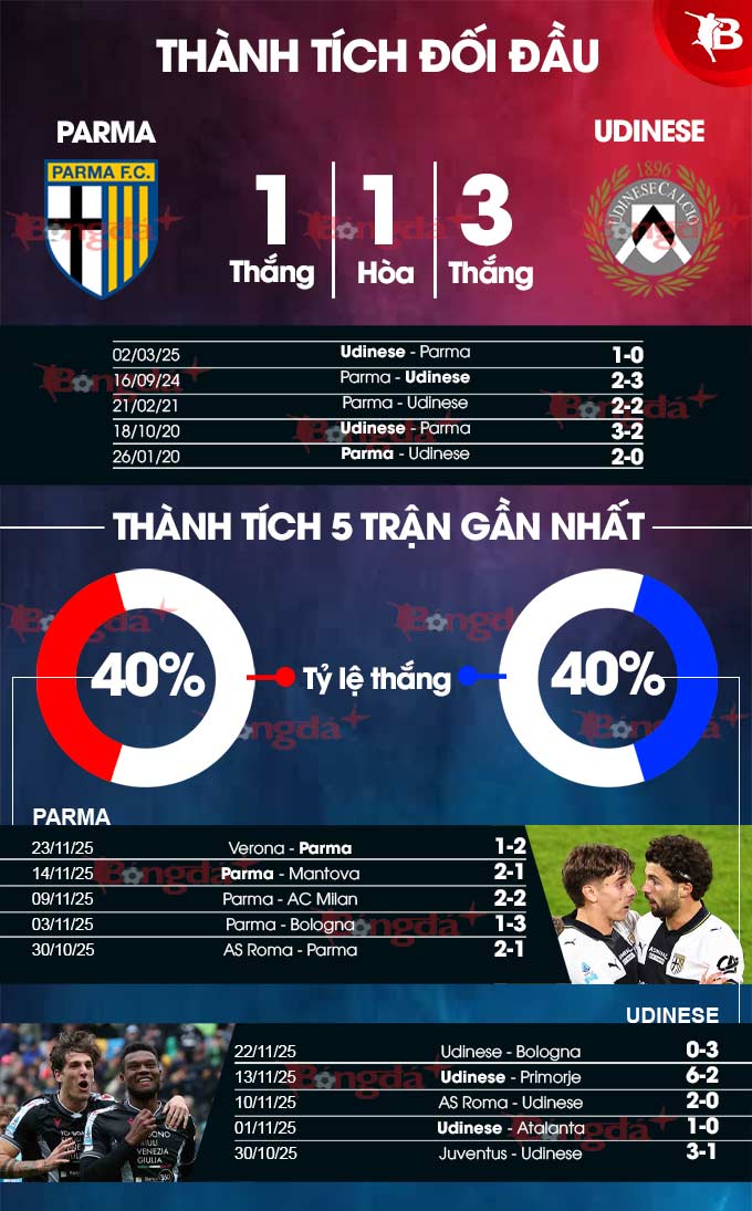 Ở mùa giải trước, Udinese từng giành chiến thắng 3-2 trên sân của Parma dù bị dẫn trước 2 bàn. Tuy nhiên, đây mới là lần đầu tiên họ kiếm trọn 3 điểm trong 6 lần gần nhất tới viếng thăm sào huyệt của Parma. Nói vậy để thấy, Parma thường có duyên mỗi khi tiếp đón Udinese.