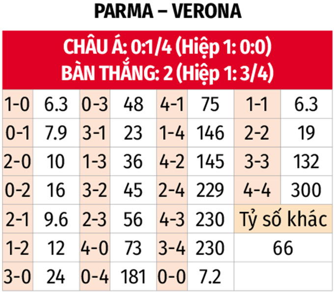 • Tối đa 2 bàn thắng: Những trận đấu sân nhà của Parma thời gian qua thường diễn ra với thế trận rất chặt chẽ và kín kẽ, khi 5 trận liên tiếp gần đây có tối đa 2 bàn thắng được ghi. Với Verona, các chân sút đội khách tịt ngòi 3/4 trận vừa qua.