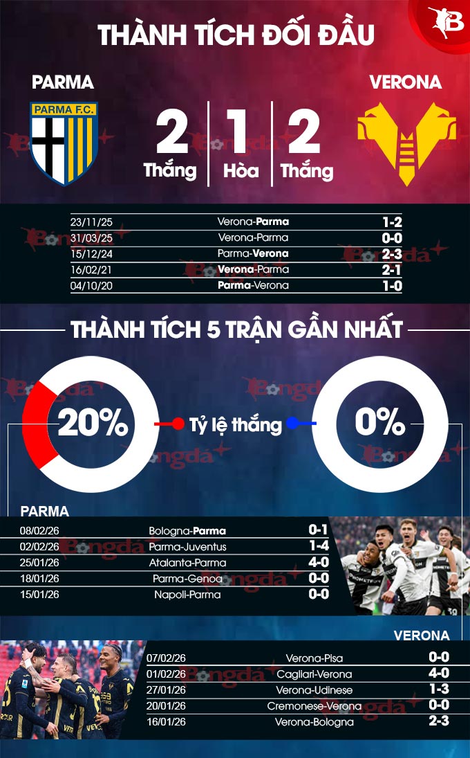 Nhận định bóng đá trận Parma vs Verona diễn ra vào lúc 21h00 ngày 15/2 ở vòng 25 Serie A. BongdaPlus phân tích thông tin lực lượng, đội hình dự kiến, dữ liệu chuyên sâu, dự đoán tỉ số.