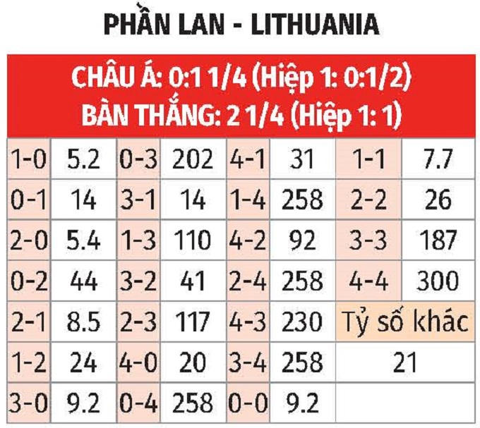- Tối đa 2 bàn thắng: Có một xu hướng rõ rệt trong 6 trận sân nhà gần nhất của Phần Lan. Họ chưa từng ghi quá 2 bàn trong bất kỳ trận nào. Trong khi đó, Lithuania chưa ghi bàn trong 4 chuyến làm khách gần đây, bao gồm cả 2 trận vòng loại.