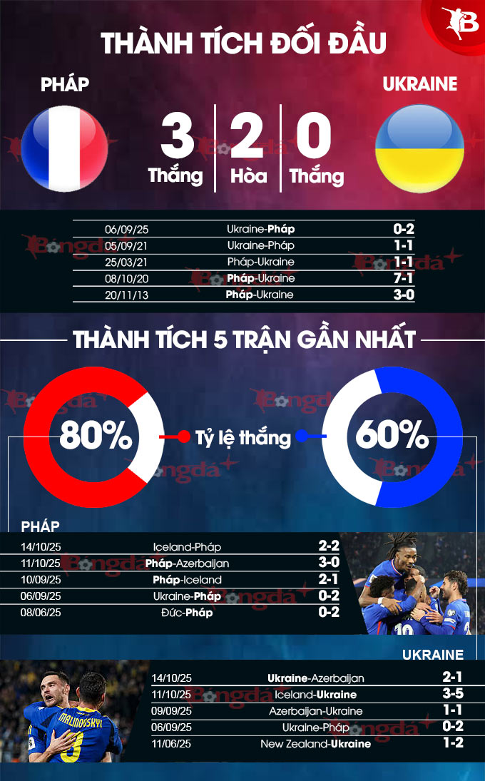 Và, xét về phong độ gần đây thì Pháp vẫn nhỉnh hơn với 4 chiến thắng và 1 trận hòa ở 5 trận gần nhất; còn Ukraine có 2 chiến thắng, 1 trận hòa và 2 thất bại ở 5 trận chính thức vừa qua. Bên cạnh đó, Les Bleus cũng đang duy trì chuỗi 5 trận bất bại trên sân nhà (4 thắng, 1 hòa) nhưng đội bóng áo vàng lại chỉ thắng 1, hòa 1 và thua 2 ở 4 chuyến làm khách gần đây.