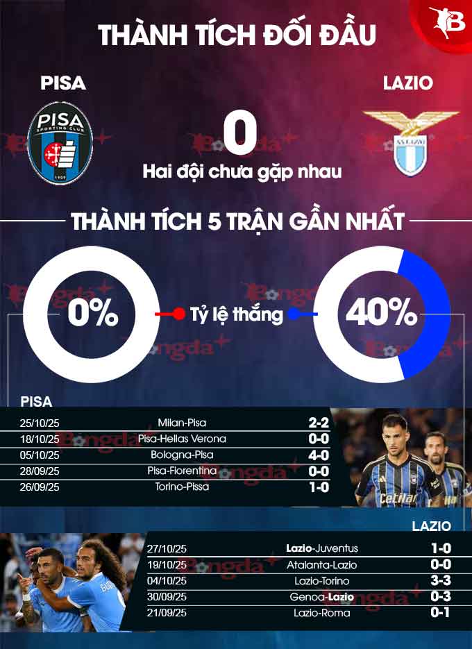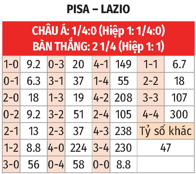 - Ít nhất 1 bàn ở hiệp 1: 3/5 trận chính thức gần nhất của Pisa có tối thiểu 1 lần lưới rung hiệp 1. 4/5 trận chính thức vừa xong của Lazio có kịch bản tương tự. NHM nên đợi sau 15 phút đầu thì đặt niềm tin vào nhiều bàn hiệp 1.