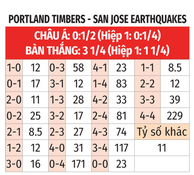 - Lẻ bàn thắng: 5/7 trận gần nhất giữa 2 CLB có tổng bàn thắng không chia hết cho 2. Ngoài ra, 3 trận mới đây của Portland Timbers và 2/3 trận vừa xong của San Jose Earthquakes đều chứng kiến điều tương tự.
