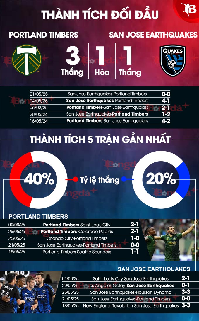 - Hai đội cùng ghi bàn: Portland Timbers đã thành công trong việc ghi bàn ở 3/5 trận gần nhất còn với San Jose Earthquakes là ở 4 trận vừa xong. Chưa hết, Portland Timbers còn làm được điều đó ở 5 trận sân nhà gần đây và với San Jose Earthquakes là ở 4/5 trận sân khách vừa qua. Với xu hướng như vậy, khả năng cao hai đội sẽ cùng tìm được đường vào khung thành của nhau.