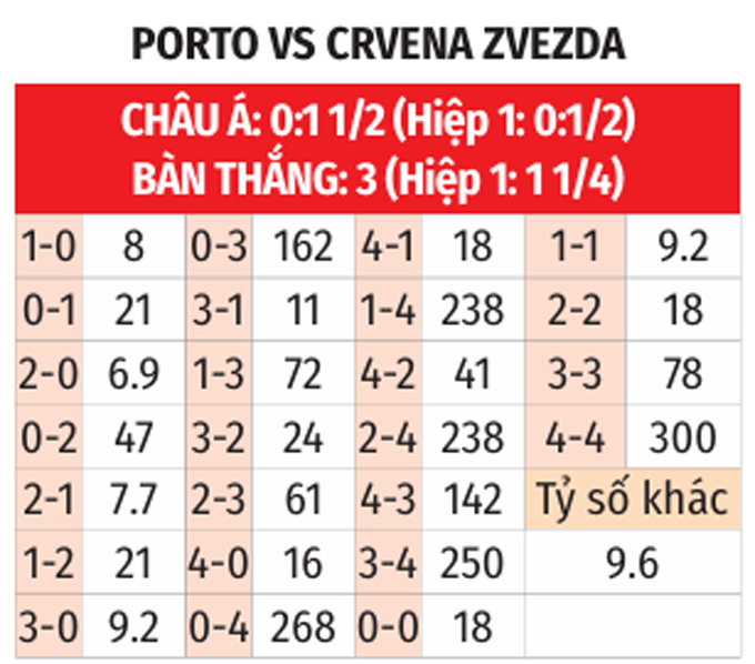 - Lẻ bàn thắng: 4/5 trận gần nhất của Porto có tổng bàn thắng không chia hết cho 2. Ngoài ra, 2/3 trận vừa qua của Crvena zvezda đều chứng kiến điều tương tự.