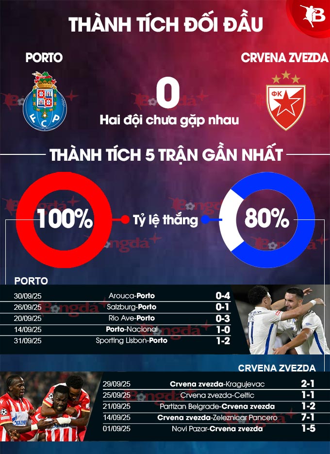 So với Porto, Crvena zvezda cũng đang thể hiện phong độ khá ổn định khi chỉ thua 1/10 trận gần nhất. Họ cũng vừa đánh bại Radnicki với tỷ số 2-1 ở giải VĐQG Serbia để tiếp tục vững ngôi đầu bảng.