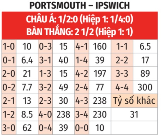 - Tối thiểu 3 bàn cả trận: 5/7 lần gặp giữa 2 đội gần đây đều kết thúc với tối thiểu 3 bàn thắng. Tình trạng tương tự xảy ra ở 3/4 trận sân nhà gần đây của Portsmouth và 4/6 trận vừa qua của Ipswich.