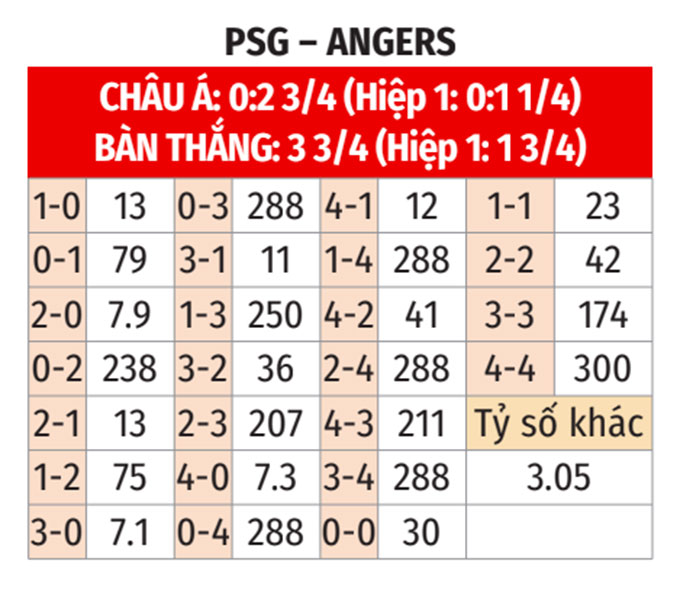 PSG cái gì cũng vượt trội so với đội khách Angers, từ đối đầu tới phong độ, thành tích sân nhà và đẳng cấp. Hơn nữa, Angers thi đấu sân khách rất kém cỏi, nên nhiều khả năng PSG sẽ lại giành chiến thắng trước “mồi ngon” này. Tỷ lệ cược chiến thắng cho PSG ở trận này được niêm yết là đặt 1 ăn 1,07.
