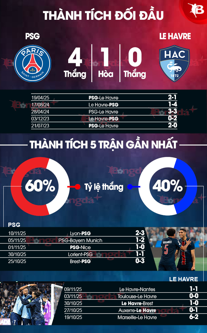 Trong lịch sử 32 lần chạm trán, PSG áp đảo với 18 chiến thắng, 10 trận hòa và Le Havre thắng 4. Tính riêng 10 trận đối đầu gần nhất, PSG thắng 9, hòa 1.