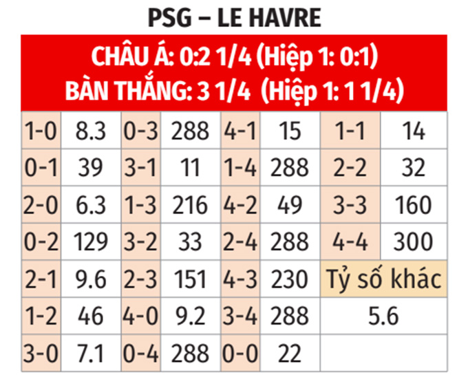- Lẻ bàn thắng: 5/8 cuộc đối đầu gần nhất tại Ligue 1 và 5/6 trận gần đây của PSG đều khép lại với tổng bàn thắng là lẻ. Ngoài ra, 3/4 lần gần nhất PSG đón tiếp Le Havre tại Parc des Princes cũng đều khép lại với tổng bàn thắng không chia hết cho 2. Trận này khó có ngoại lệ.