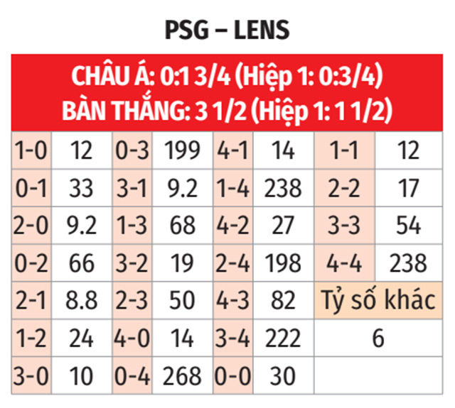 - X cả trận: 4 trận gần đây của Lens chỉ có tối đa 3 bàn. Thực tế trên cộng với việc 3/4 trận gần nhất giữa đội bóng này và PSG về X là lý do các nhà đầu tư không nên kỳ vọng trận tới về T.