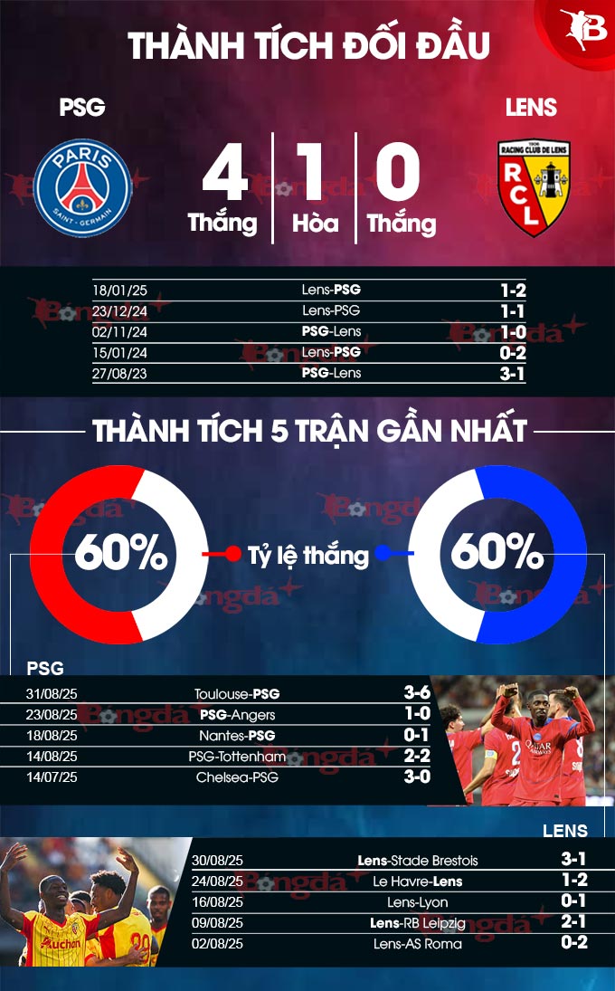 Ở 3 lần đụng độ Lens gần đây, PSG chỉ giành được 2 chiến thắng sát nút và 1 lần để cho đối phương cầm hòa. Với lợi thế sân nhà, PSG đủ khả năng thu về 3 điểm trọn vẹn, nhưng đây hứa hẹn sẽ là trận đấu chật vật với nhà đương kim vô địch Ligue 1.
