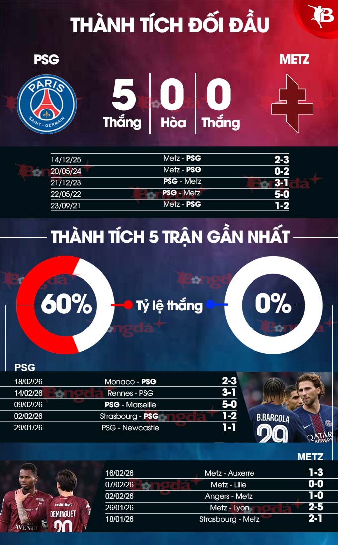 Và, PSG có thể tin vào một chiến thắng đậm trước Metz, sau khi lội ngược dòng thành công để giành thắng lợi 3-2 trên sân Louis II của Monaco tại lượt đi vòng play-off Champions League 2025/26.