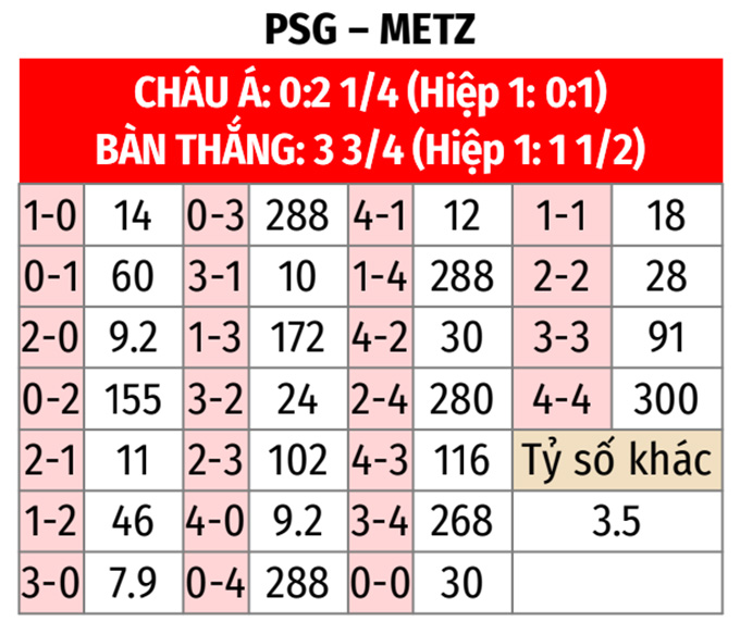• PSG thắng theo châu Á: PSG thắng 7/9 cuộc đón tiếp Metz gần nhất tại Ligue 1, thắng 4/5 trận sân nhà vừa qua tại Ligue 1. Còn Metz thua 3/4 trận vừa qua. Vì thế, những người yêu mến PSG có thể tin vào họ ở trận này.