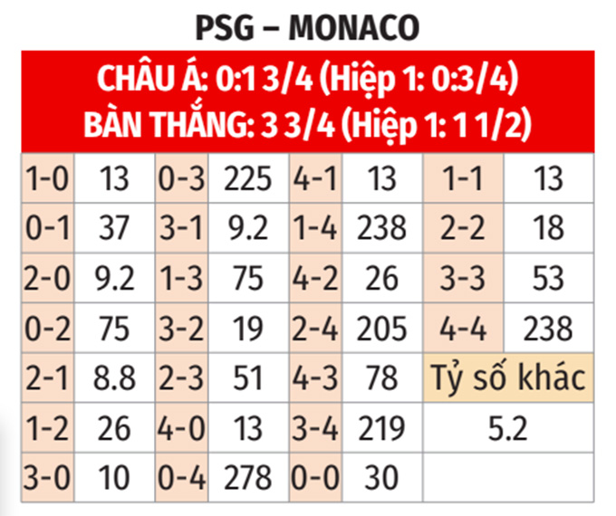 - Hiệp 1 không quá 1 bàn: 5/6 cuộc chạm trán gần nhất, cả 2 trận gần đây của PSG và 8/10 trận vừa qua của Monaco đều khép lại hiệp 1 với tối đa 1 bàn thắng. Không những thế, cả 5 chuyến làm khách vừa qua của Monaco cũng chứng kiến không quá 1 lần lưới rung trong hiệp 1.