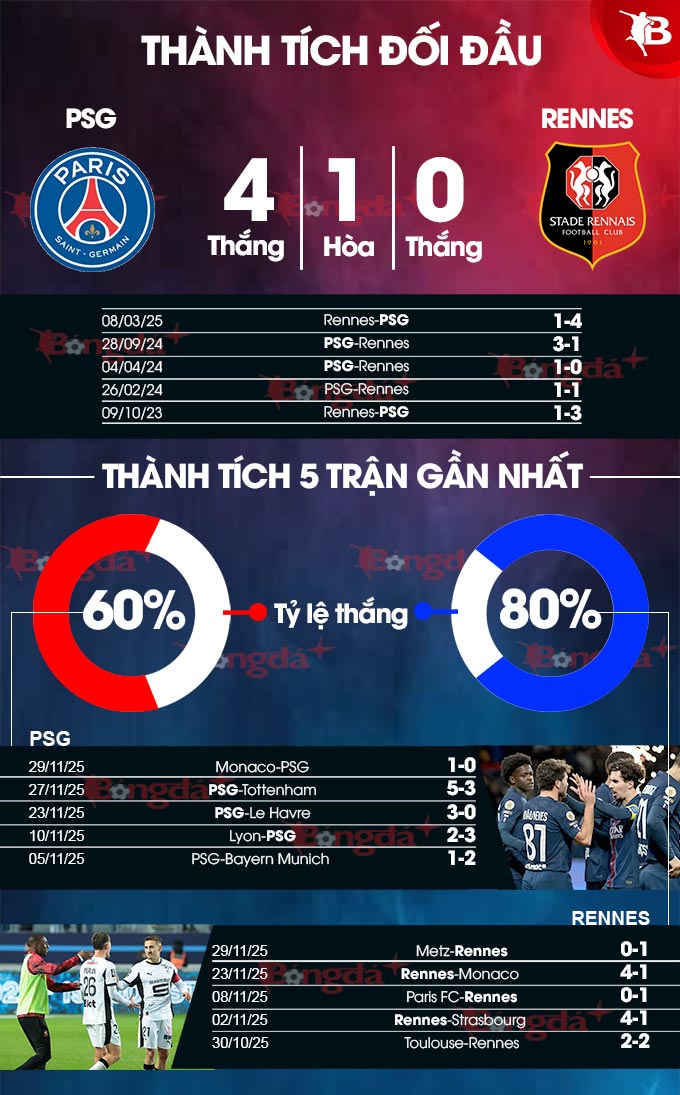 - Hai đội cùng ghi bàn: PSG luôn ghi ít nhất 1 bàn ở 12/13 trận gần nhất, Rennes cũng làm được điều tương tự ở cả 8 trận vừa qua. Ngoài ra, PSG cũng ghi được bàn ở 19/20 trận sân nhà vừa qua và Rennes cũng xuyên thủng lưới đối phương ít nhất 1 lần ở cả 6 chuyến xa nhà gần nhất. Trận này khó có ngoại lệ.