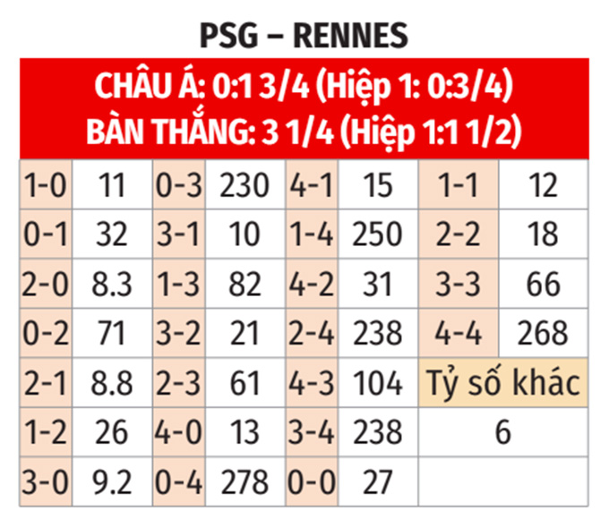 - Rennes thắng theo châu Á: Rennes thắng cả 5 trận gần đây theo châu Á. Họ cũng thắng cả 3 chuyến làm khách vừa qua theo châu Á. Trong khi PSG lại thua 4, hòa 1, chỉ thắng 2 ở 7 trận gần nhất. Vì thế, giới mộ điệu có thể đặt niềm tin vào Rennes ở trận này.