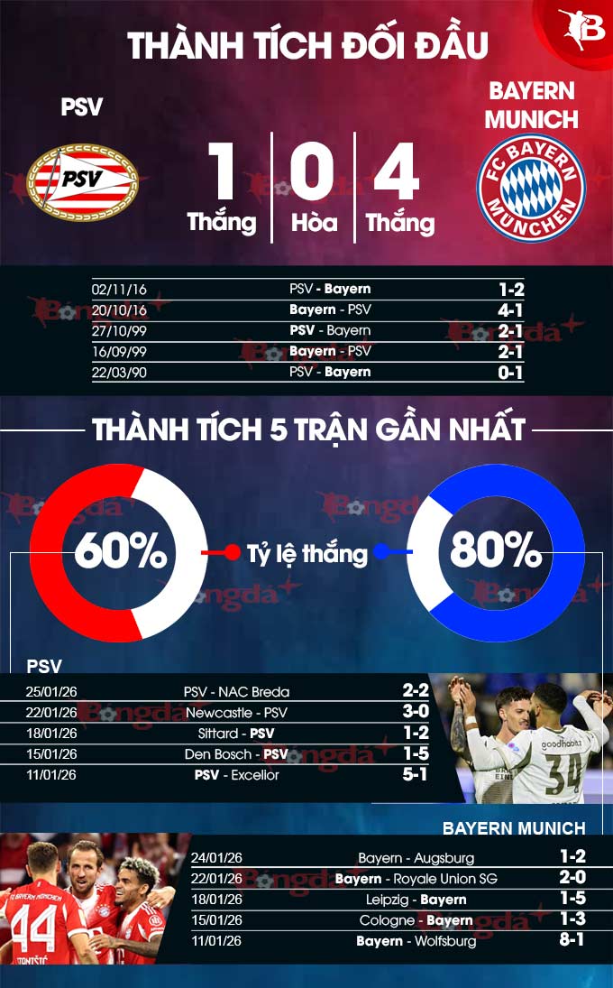 Phong độ của PSV và Bayern đều đang rất ổn vào lúc này khi chỉ thua 1/8 trận gần nhất. PSV có lợi thế sân nhà và đang có thành tích tốt ở đây khi chỉ thua 1/10 trận mới nhất. Còn với Bayern, họ cũng chẳng ngại sân khách khi thắng 8, hòa 1 và thua 1 ở thời gian gần đây. Chưa hết, 2 lần đối đầu với PSV trong quá khứ, Bayern đều thắng. Xem ra, lần gặp tới này không có ngoại lệ.