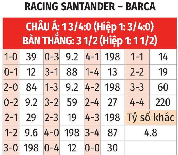 - Hiệp 1 có ít nhất 2 bàn: 4/5 trận sân nhà gần đây của Racing Santander cùng 2 trận vừa qua của Barca đều có từ 2 bàn thắng trở lên trong 45 phút đầu. 5/6 trận đối đầu gần nhất cũng xuất hiện tối thiểu 2 bàn trước giờ nghỉ.