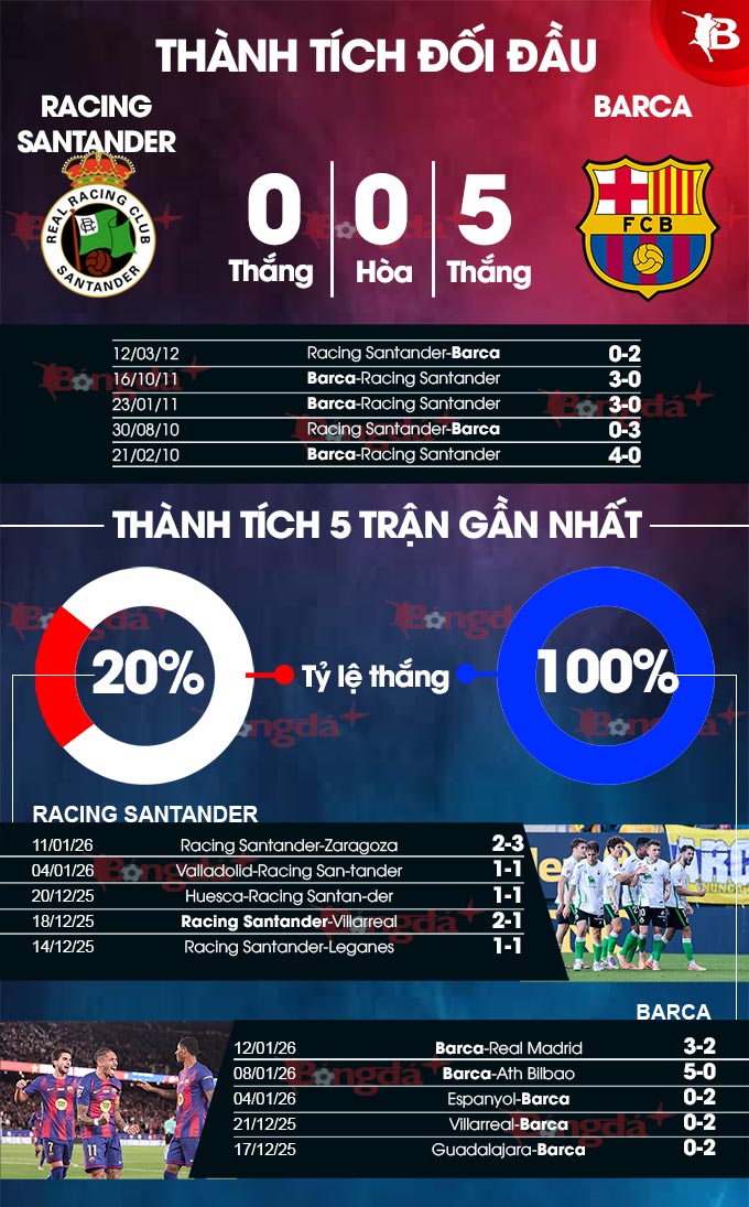 - Nhiều bàn thắng: 3/5 trận sân nhà gần đây của Racing Santander cùng 2 trận liên tiếp vừa qua của Barca đều có tối thiểu 4 bàn thắng được ghi. Với hàng công đang chơi bùng nổ thời gian qua, Barca khả năng sẽ tạo mưa bàn thắng.
