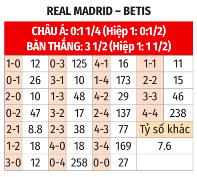 - Tối đa 1 bàn hiệp 1: 7/9 cuộc chạm trán gần nhất giữa hai đội đều khép lại với không quá 1 bàn thắng trong hiệp đấu đầu tiên. Kịch bản tương tự cũng diễn ra ở 7/8 cuộc đối đầu gần đây giữa hai đội tại sân Bernabeu. Hơn nữa, cả 3 trận gần đây của Betis và 8/11 chuyến làm khách vừa qua của Betis cũng có tối đa 1 lần lưới rung hiệp 1.