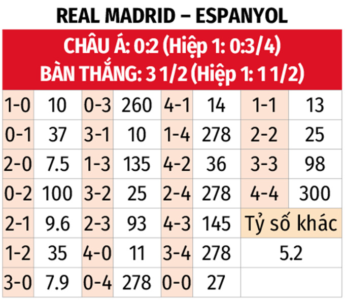 Từ 3 bàn thắng trở lên: 4 trận liên tiếp gần đây của Real Madrid đều có ít nhất 3 bàn thắng được ghi. 3/4 trận vừa qua của Espanyol cùng 3 trận đối đầu gần nhất trên sân Bernabeu thậm chí xuất hiện tối thiểu 4 bàn.