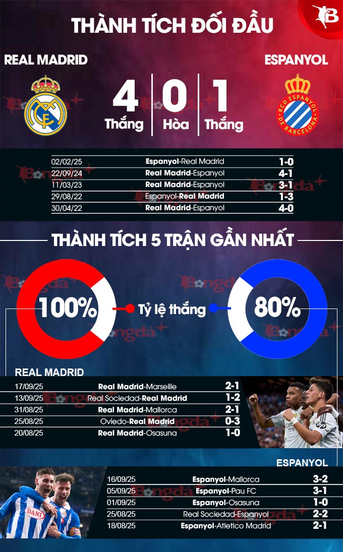 Lịch sử có thể chống lại Espanyol, nhưng cần nhấn mạnh rằng lần gần nhất gặp nhau họ đã đánh bại Real Madrid trên sân nhà của mình. Cộng thêm tinh thần hưng phấn từ đầu mùa giải và việc Real Madrid mất Dean Huijsen do án treo giò cũng như việc căng mình thi đấu hồi giữa tuần, Periquitos có thể sẽ khiến đối thủ gặp khó.