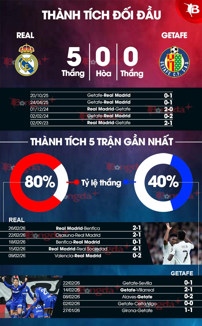 Đội bóng của Alvaro Arbeloa có thành tích sân nhà tốt thứ 3 tại La Liga mùa này khi giành được 33 điểm sau 12 trận. Chiều ngược lại, Getafe lại chỉ thắng 3/10 trận sân khách gần nhất, tính trong 90 phút. Hơn nữa, Real có thành tích đối đầu cực kỳ ấn tượng với Getafe khi giành chiến thắng ở 31/41 trận đấu gần nhất giữa hai đội trên mọi đấu trường. Nếu chỉ tính giai đoạn gần đây thì Getafe thua cả 8 trận gần nhất gặp Real Madrid.