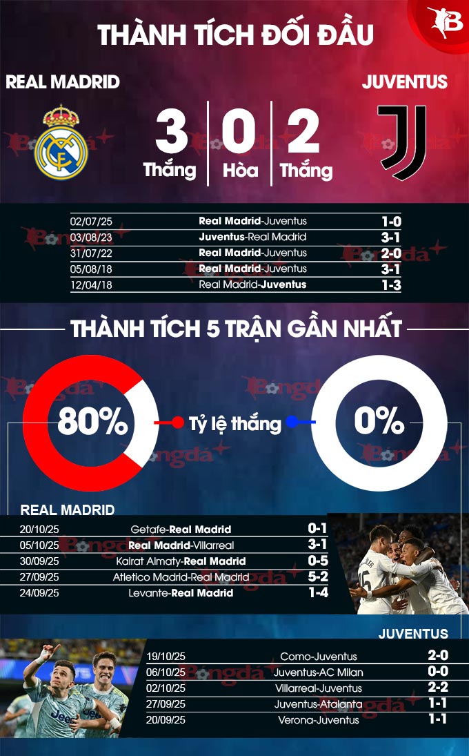 - Từ 3 bàn thắng trở lên: 4/5 trận gần đây của Real Madrid cùng 2 trận tại vòng phân hạng Champions League của Juventus đều có tối thiểu 3 pha làm bàn. 5/7 trận đối đầu gần nhất cũng có không dưới 3 pha làm bàn.