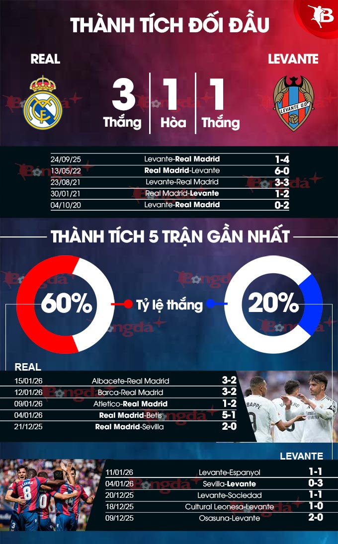 Xin nhấn mạnh rằng, Levante là đối thủ rất yếu. Họ đang xếp ở vị trí thứ 2 từ dưới lên tại La Liga, trong đó mới giành được 3 chiến thắng kể từ đầu mùa bóng đến giờ. Một trong những nguyên nhân chính dẫn đến sự bết bát của Levante là hàng thủ thiếu chắc chắn. Điểm yếu chết người này nhiều khả năng sẽ bị các chân sút của Real Madrid khai thác, đặc biệt khi họ có sự trở lại của Kylian Mbappe – tiền đạo đang dẫn đầu danh sách “Vua phá lưới” La Liga mùa này với 18 bàn thắng.