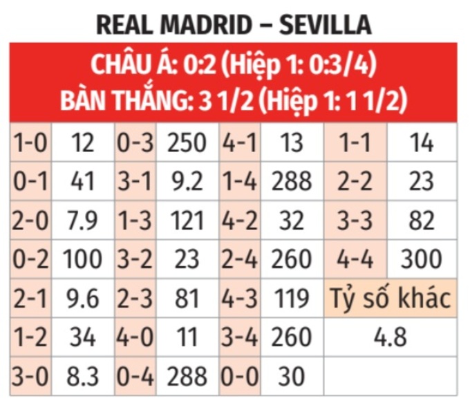 - Tối đa 3 bàn thắng: 4/5 lần gặp giữa 2 đội gần đây chỉ có nhiều nhất 3 bàn thắng. 5/6 trận gần đây của Real Madrid và 7/8 trận vừa qua của Sevilla tương tự.