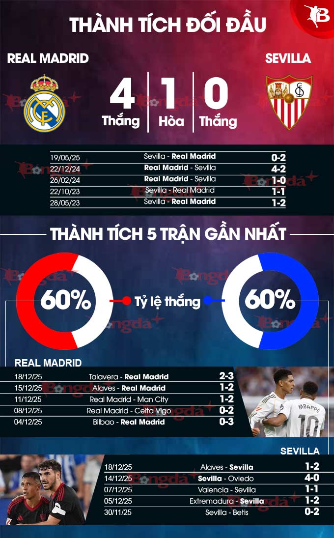 Cũng trên sân nhà, Real Madrid có truyền thống đánh bại Sevilla. Những con số thống kê chứng tỏ điều đó. Bằng chứng là trong 20 lần gần đây đón đội bóng xứ Andalucia ở thánh địa Beranbeu, đội bóng thủ đô Madrid chưa từng nếm mùi thất bại. Thành tích cụ thể của họ là hòa 2 và giành tới 18 chiến thắng, gần nhất là chiến thắng 4-2 ở La Liga mùa trước.