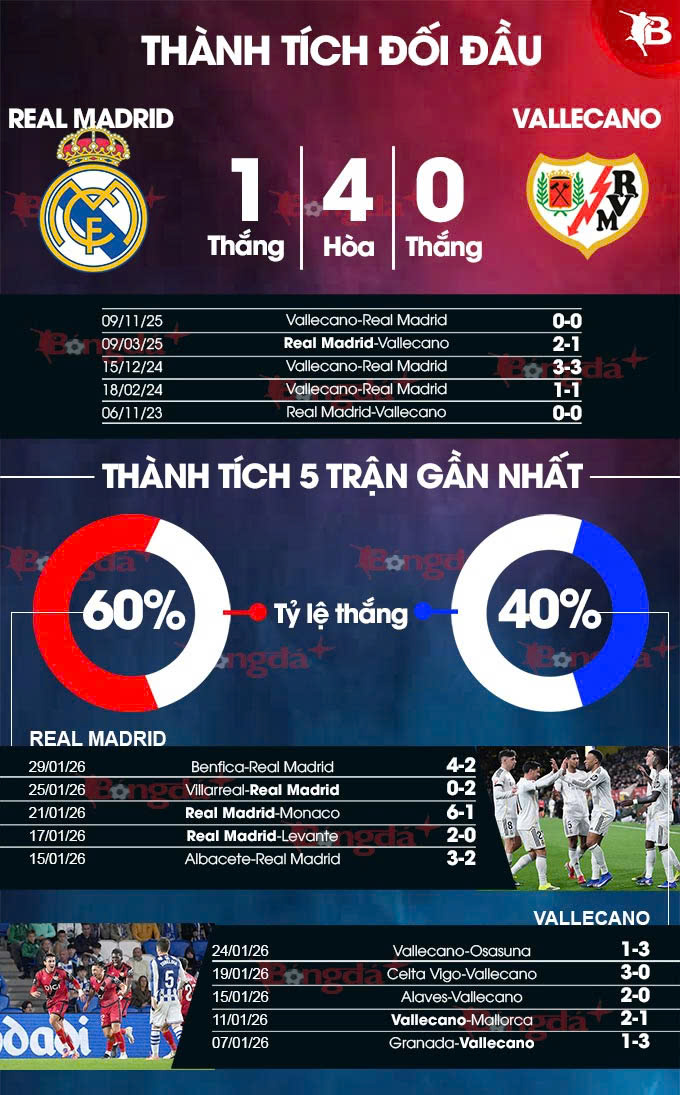 Hơn nữa, Real Madrid lại có lợi thế sân nhà và có thành tích tốt tại đây khi thắng 8/10 trận vừa qua. Chiều ngược lại, Vallecano chỉ thắng sân khách có 2 lần ở cùng thời gian.