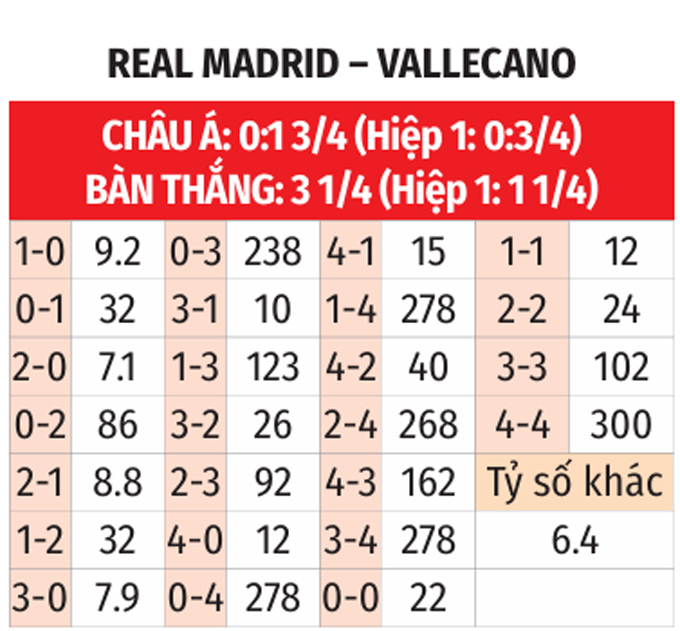 - Lẻ bàn thắng: 6/10 trận so T gần nhất giữa 2 CLB có tổng bàn thắng không chia hết cho 2. Ngoài ra, 6/10 trận sân nhà gần nhất của Real lẫn 6/10 trận sân khách vừa xong của Vallecano cũng chứng kiến điều tương tự.